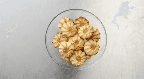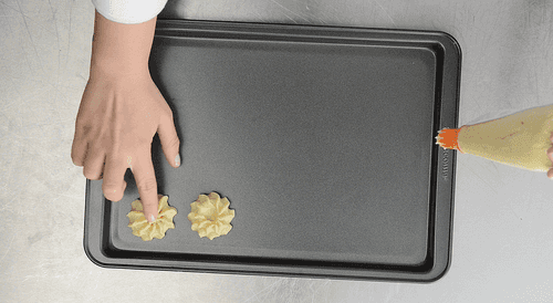 Transfer the dough to a piping bag and squeeze out small cookies onto the baking sheet.