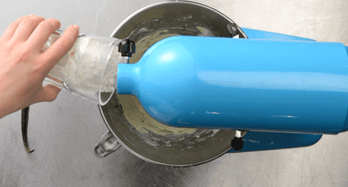 Add the egg whites and flour. Remove the seeds from the vanilla pod and add them to the dough.