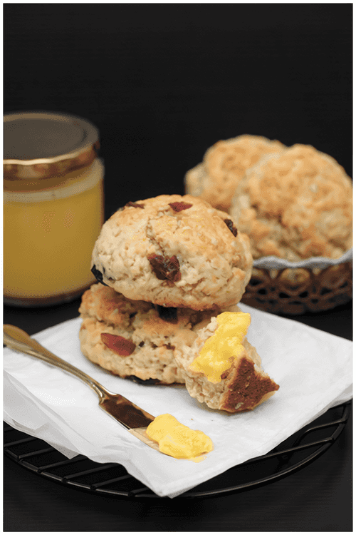 Blend the butter, flour, oats, sugar, baking powder, lemon zest, and salt until crumbly. Add one egg, raisins, and cream, and mix well again.