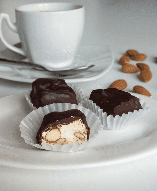 Nougat with almonds in chocolate is a refined treat that embodies the best traditions of European confectionery. Its history dates back to medieval Europe when caramel masters sought ways to combine nuts and sweet masses. The protein nougat, infused with the aroma of honey, has an airy and delicate texture, while roasted almonds add a light crunch. Coated in chocolate, it becomes a true delight—a combination of softness, sweetness, and rich nutty-chocolate flavor. It is the perfect dessert for festive gatherings or cozy tea times, highlighting the elegance and sophistication of European cuisine.