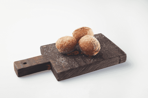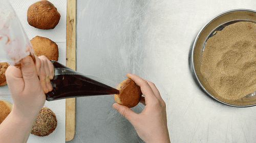 When the donuts cool down enough not to burn your fingers, roll them in a mixture of sugar and cinnamon. Then, carefully make a hole in the donut and fill it with jam about three-quarters full.