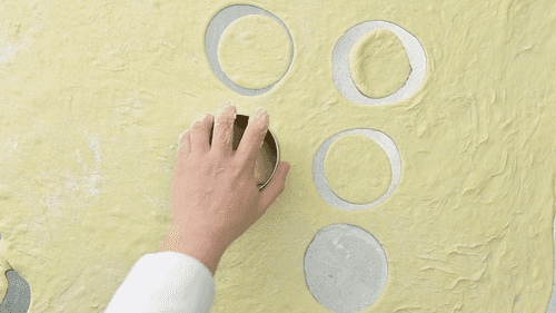 When the dough rises, knead it and roll it out to a thickness of 1.5–2 cm. Cut out twelve circles about 10 cm in diameter. Place the dough on a baking sheet lined with parchment paper and generously sprinkled with flour.