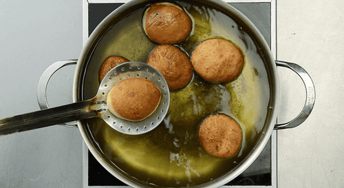 Remove the donuts with a slotted spoon and place them on a napkin to drain the oil. Allow the donuts to cool.