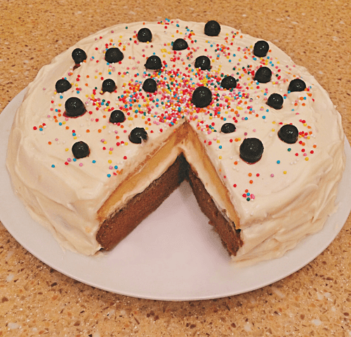 Cover the entire cake with the remaining cream and decorate it with berries and decorative sprinkles on top.