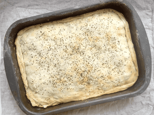 Grease the baking dish with oil, layer thinly rolled dough and filling (up to 5-6 layers), grease the top layer with oil and sprinkle with herbs.