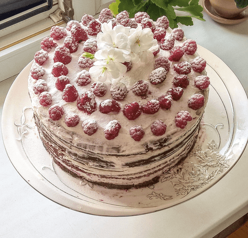Spread cream on the syrup-soaked layer, top with raspberries, then another layer, cream, raspberries. Cover the last layer with cream and decorate with raspberries.
