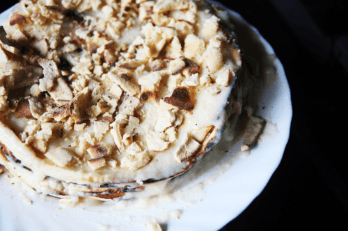 The cream is ready. We layer the cakes, spreading cream on each and on the sides. We sprinkle the cake with leftover crumbs. We put it in the fridge for an hour until the cream sets.