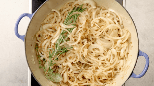 Meanwhile, prepare the filling: heat the remaining butter in a skillet over medium heat, add finely chopped anchovies and cook, stirring constantly, for about 7 minutes until the anchovies dissolve in the butter. Slice the onion into thin half-rings and add to the anchovies along with herbs; season with salt and pepper, cover with a lid and cook occasionally stirring until soft for about 1 hour. Remove the lid and cook for another 30 minutes until the onion turns golden and the liquid evaporates. Remove from heat, take out the rosemary and thyme stems and bay leaf and let cool.