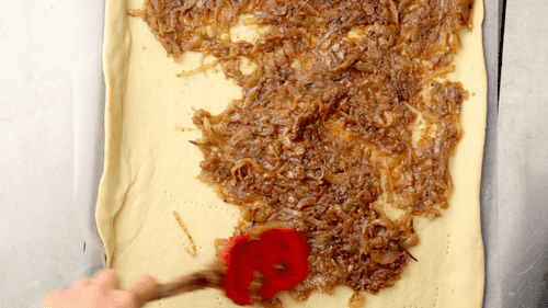 Preheat the oven to 200°C. Remove the film from the dough and roll it out on a floured surface. Line a baking tray with parchment paper and transfer the dough onto it. Spread the onion filling evenly over the dough. Cut the olives in half and place them on top of the filling. Loosely cover the tart with film and let it rest for another hour to rise. Bake for 20 minutes until the dough is golden. Let it sit for 10 minutes before cutting into squares and serving.