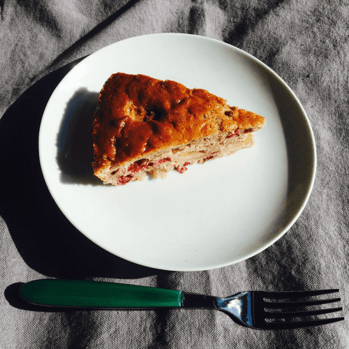 Pour the batter over the apples and lingonberries in the mold and send it to the oven.