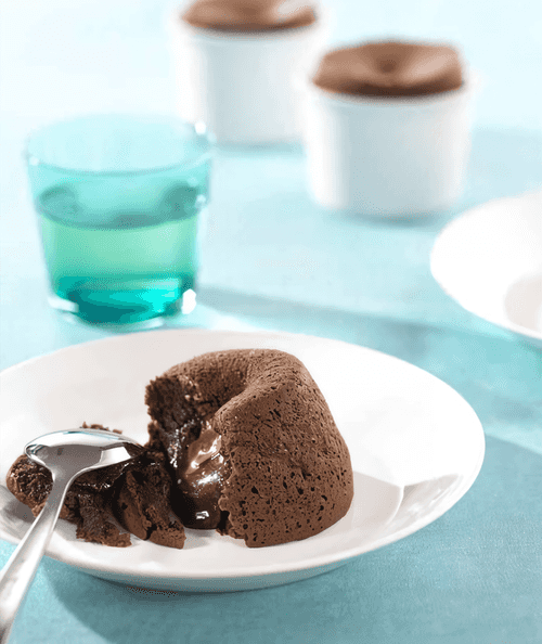 Place the molds in a hot oven and bake until done for about 12 minutes. Invert the contents of the molds onto plates and serve immediately.