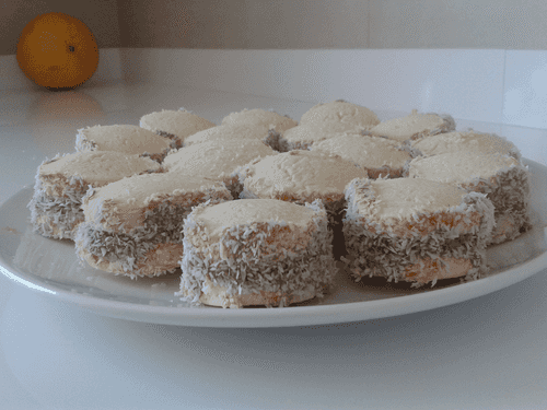 Coat the sides of the resulting 'sandwich' with condensed milk and roll in coconut flakes.