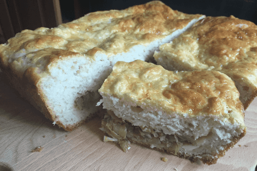 Cabbage pie with quail eggs and cheese