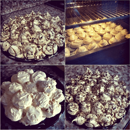 Decorate by placing beautiful meringues on top with cream. Drizzle with chocolate topping and chocolate crumbs, then refrigerate to soak.