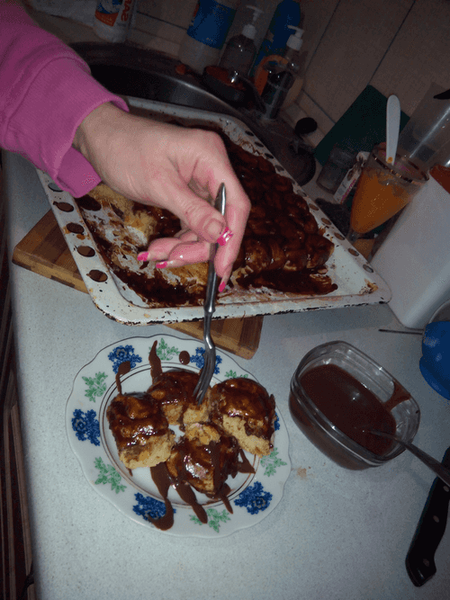 Cut the roll into pieces and place them on a baking sheet with the cut side up, close together. Brush each piece with sour cream and put it in the oven at 200 degrees on the top rack until cooked. Once the buns are ready, let them cool slightly and glaze each one.