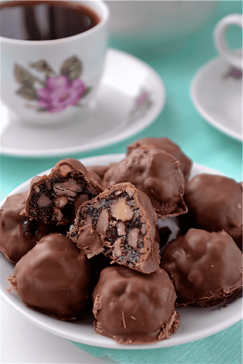 Put the nut balls in chocolate, then take them out onto a plate. You can roll them in chocolate or coconut flakes, or colorful sprinkles — the imagination has no limits. If desired, place them in the refrigerator.