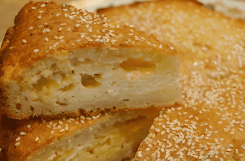 Cheese pie with cottage cheese is a cozy and aromatic dish from European cuisine. Its delicate dough, complemented by the creamy taste of cottage cheese and a rich cheese filling with herbs and garlic, creates a harmony of flavors. This pie is an ideal choice for a cozy family dinner or an evening tea party. The history of such pies goes back centuries when baked goods with cottage cheese filling were popular in rural homes. The golden crust, crispy sesame seeds, and warm aroma make this dish a true gastronomic delight. It can be served as a standalone dish or as an addition to a light salad, while its soft texture and rich flavor make it indispensable on the table of every home cooking enthusiast.