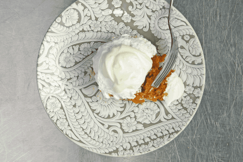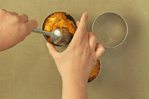 Add 40 g of protein, 30 g of flour, and a pinch of cinnamon to the carrot mixture. Form towers of 140 g (can be placed using a culinary ring), bake at 180 degrees for 4-5 minutes.