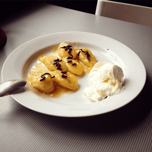 Fried banana with rum sauce and dark chocolate