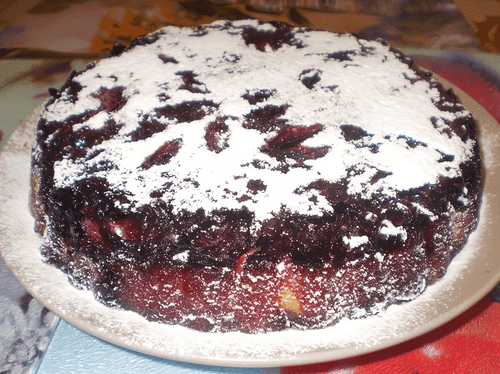 Check the pie's readiness with a wooden skewer. After baking, let it cool slightly and dust with powdered sugar and almond petals.