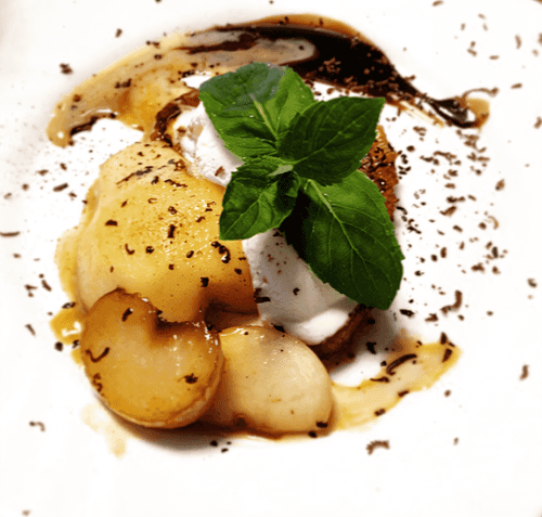 We place the fruits on plates and top them with ice cream. Be sure to drizzle with the sauce that should have appeared after our alcohol trick. Pour a small amount of chocolate sauce on the plate and gently draw from the center of the sauce with a tablespoon to the side. It should create a beautiful drop. Grate chocolate on a fine grater and decorate our artwork with a sprig of mint.