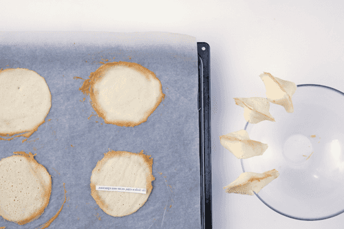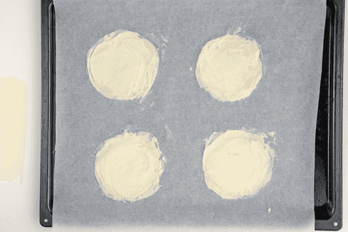 Using a culinary ring, draw circles on parchment. Flip the parchment over and place it on a baking sheet. Place 1 tablespoon of dough on the parchment and spread it into a circle using a stencil. Bake for 4-5 minutes until the edges turn golden.