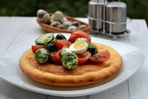 Yorkshire pudding with cheese and vegetables is an original interpretation of the classic British dish that originates from Yorkshire. Traditionally served with meat and gravy, this version with Adyghe cheese and fresh vegetables transforms the pudding into a light and sophisticated dish. The delicate batter baked to an airy golden crust pairs perfectly with the aromatic filling of cheese, herbs, and quail eggs. The taste balance: crispy, creamy, refreshing. It can be served as a hearty breakfast or a light dinner, and adding a salad brings freshness to the dish. This combination of textures and flavors makes it special, while the traditional base adds notes of nostalgia.