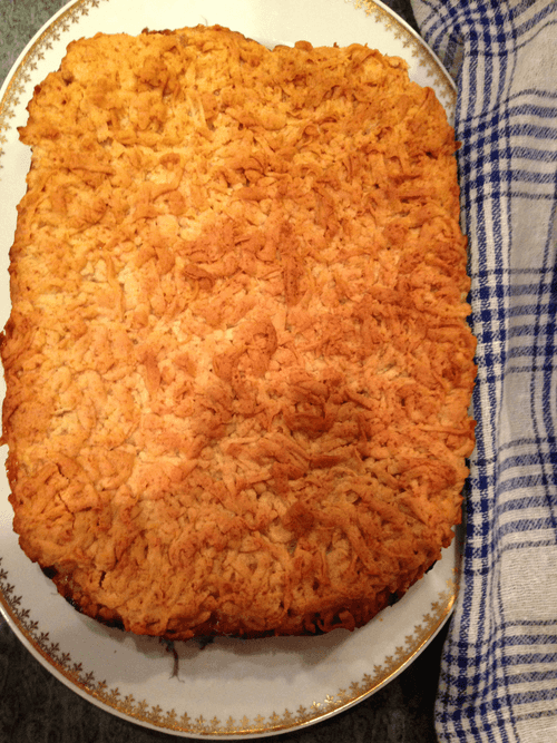 We take it out when it turns golden brown and the smell becomes unbearable yet pleasant. Let it sit for 10-15 minutes, remove from the mold onto a board and cut into squares (straight) or diamonds (diagonally) with a pizza cutter. You can sprinkle a little powdered sugar on top (it won't affect the sugar much). Arrange on a plate, let cool — and finally, we can eat!..