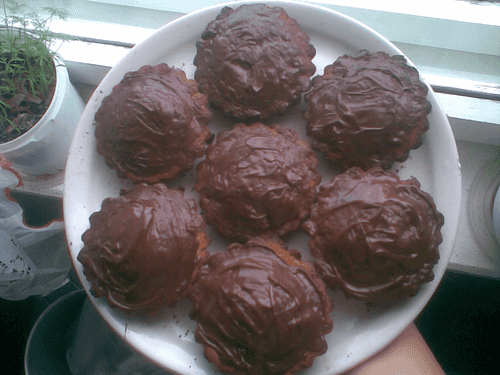 While the cake is warm, you can spread chocolate on top or sprinkle with powdered sugar.