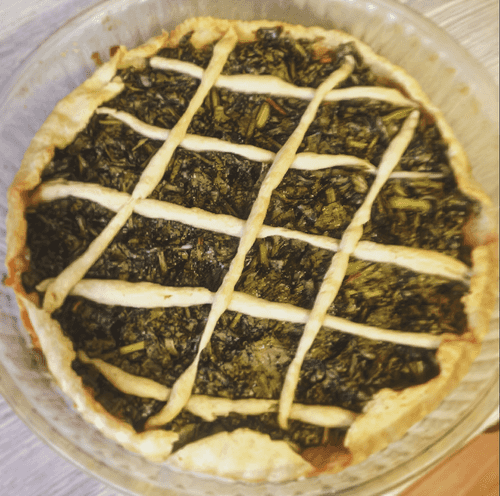 Roll out the dough into a shape. Lay down the sorrel. For beauty, you can make a lattice from the dough on top, or leave the pie open.