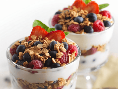 Place 2 tablespoons in a dessert bowl or wide glass and add 2 tablespoons of granola and 2 tablespoons of berries on top. Repeat this sequence 2 more times.