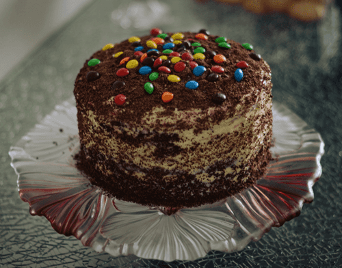 Then we take out the cake and coat it with cream again. You can sprinkle grated chocolate on top and on the sides. Also, you can place colorful candies like M&M's on top of the cake.
