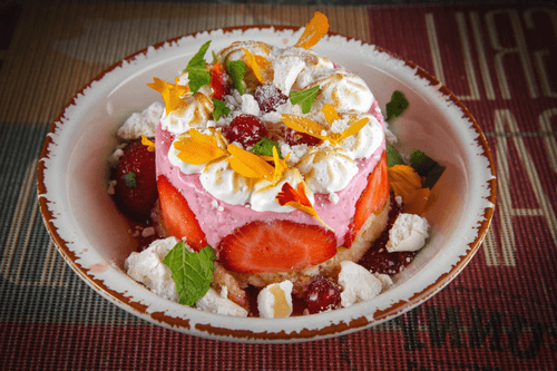 Strawberry sour cream cake with steaming meringue from Funny Cabany