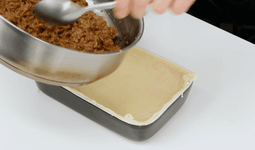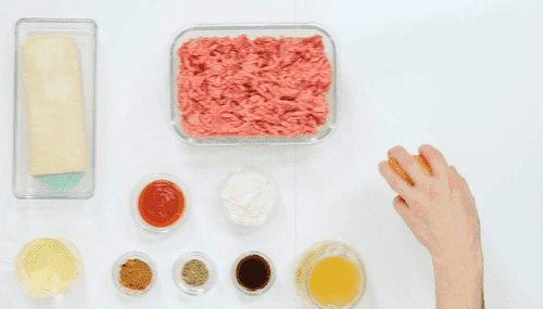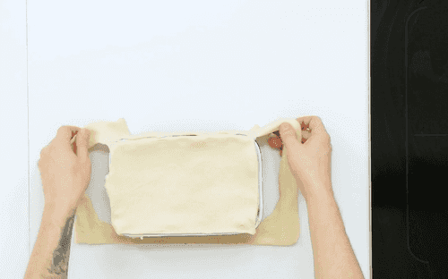 Grease the dough sheets and the mold with oil and egg, then pour the meat mixture into the mold with the dough.