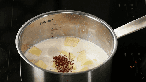 Heat the milk with butter over low heat until the butter melts. Add saffron.