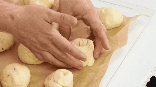 Form balls from the dough and place them on baking paper, cover with a towel, and leave for 30 minutes to let the dough rise.