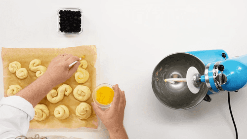 Slightly beat the egg with a fork and brush the buns with it. Decorate the buns with raisins and send them to an oven preheated to 200 degrees for 15 minutes.