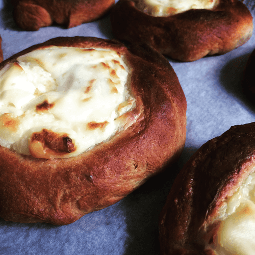 We grease our hands with oil, divide the dough, roll out medium circles, press them down, add the filling, and fold the edges, leaving the center open. They resemble cheesecakes in shape. We grease the open part with sour cream and place a small piece of butter in the center, while greasing the edges with egg yolk.