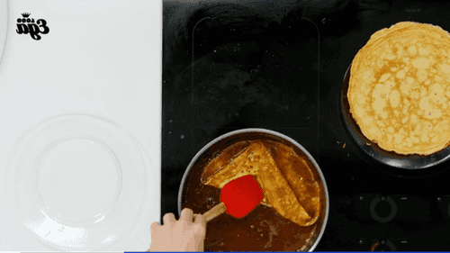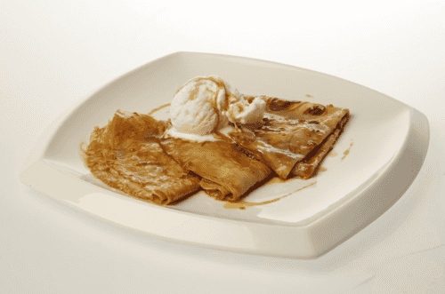 Soak each pancake in sauce directly in the pan, fold them into quarters, and leave them in the pan. Serve 3-4 pancakes per portion with a scoop of vanilla ice cream.