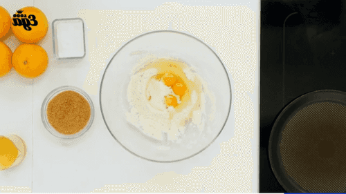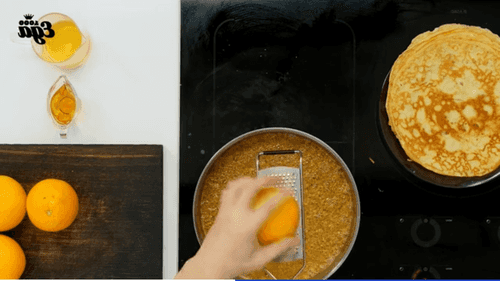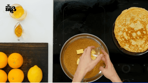 Add lemon and orange zest, and freshly squeezed orange juice. Let it sit for 3-4 minutes to thicken, then pour in 'Grand Marnier' and cognac, heat for a few seconds, and reduce the heat.
