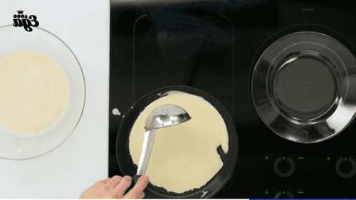 Fry thin pancakes on a heated skillet on both sides until golden brown.
