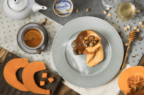 Pumpkin muffins with carrot cream and caramel are the true embodiment of autumn coziness and warmth. Their story begins in European cuisine, where pumpkin and carrot have long been used to create aromatic baked goods. Delicate, airy muffins with a rich pumpkin flavor perfectly complement the light carrot cream based on cream cheese, giving the dessert softness and freshness. The caramel with hazelnuts adds a spicy sweetness and crunchy texture, turning each serving into a true gastronomic delight. These muffins are suitable for both cozy family tea gatherings and festive dinners, surprising guests with their unusual combination of ingredients and delightful taste.