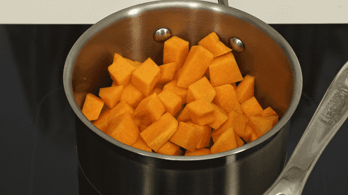 Peel, chop, and cook the carrot and pumpkin in separate pans until done.