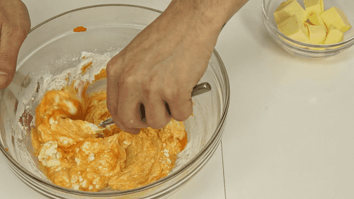 Add cream cheese Almette and powdered sugar to the carrot puree, mix until a smooth cream.