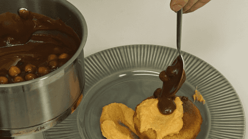 Make caramel: melt sugar in a saucepan over low heat, then add butter and stir until melted. Next, pour in the cream and stir until fully combined. Add hazelnuts to the finished caramel.