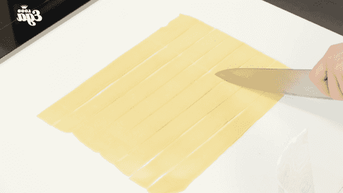 Cut the dough into narrow strips 10–12 cm long.