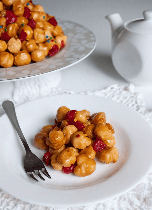 Neapolitan dessert is a true embodiment of Italian culinary tradition, where delicate dough infused with citrus and cognac aroma transforms into golden crispy balls. They are coated with honey glaze that absorbs sweetness, and the finishing touch is candied fruits that give the dessert a festive look and a subtle fruity note. The origins of this treat go back centuries and are linked to the southern regions of Italy where simple ingredients are combined to create rich flavor compositions. This dessert is perfect for festive occasions, especially at Christmas when it is traditionally arranged in a mound shape symbolizing abundance and family warmth. Each piece offers a harmony of textures: a crispy crust, soft center, and sticky honey sweetness creating an unforgettable taste experience.