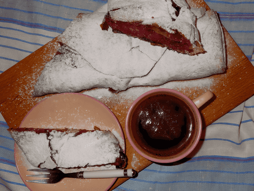 Transfer the strudel using a towel onto the baking paper, seam side down;