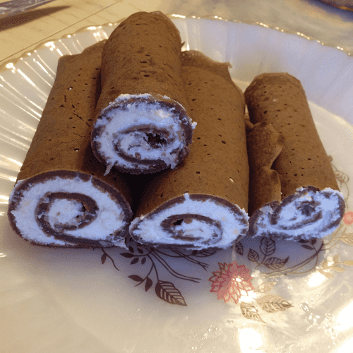 Spread the filling on the pancakes and roll them up; each pancake can be cut in half.