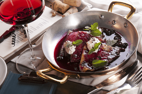 Buckwheat pancakes with beetroot, black currants, and ricotta cheese are an exquisite dish of French cuisine that combines the sweetness of berries, the richness of beets, and the delicate texture of ricotta. Classic crepes are thin, airy pancakes filled with an unusual mousse made from roasted beets and black currants, creating a harmony of sweet and sour notes with earthy aromas. The addition of soft cheese gives the dish a creamy texture and sophistication. The history of crepes dates back to Brittany, where they were cooked on stone slabs and served with various fillings. This dish is perfect for breakfast or a light dessert, and its rich color and flavor make it appealing to gourmets who appreciate culinary discoveries.